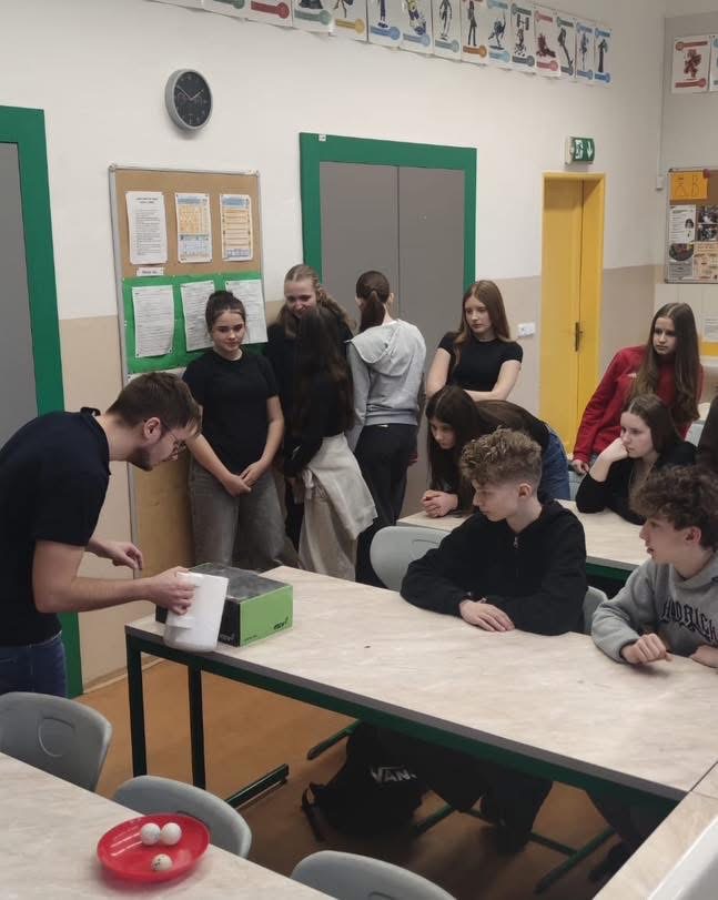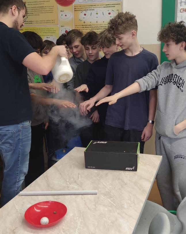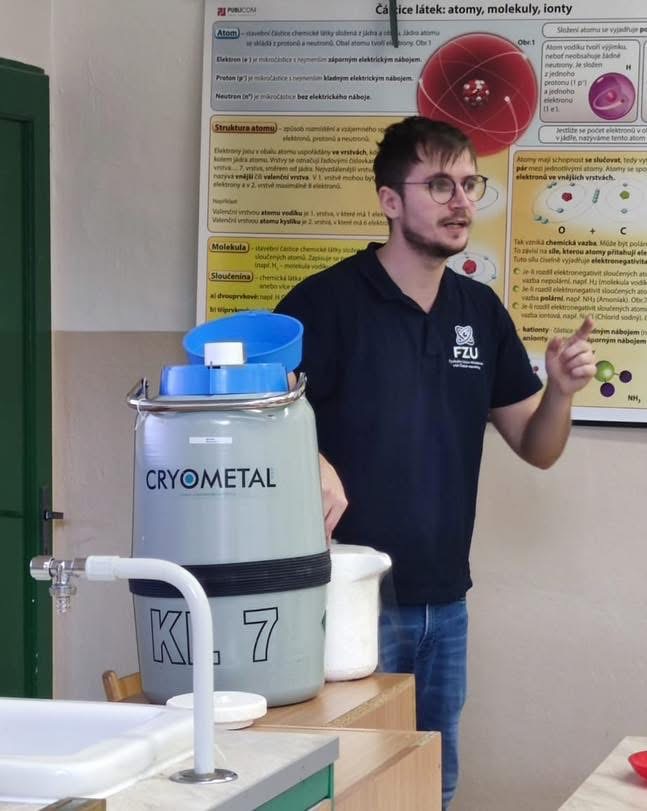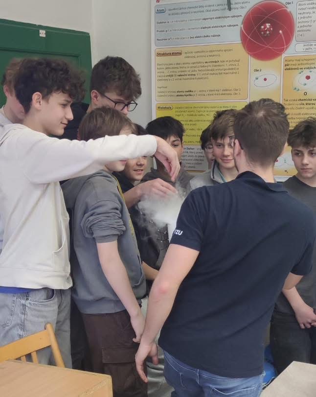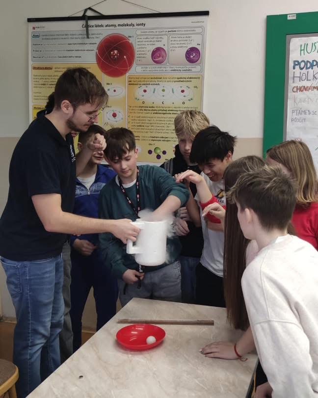 Ve čtvrtek, 26.3.2026, navštívil naši školu pan Dejan Prokop, vědec z Fyzikálního ústavu Akademie věd ČR, aby osmákům přiblížil chování látek při nízkých teplotách.